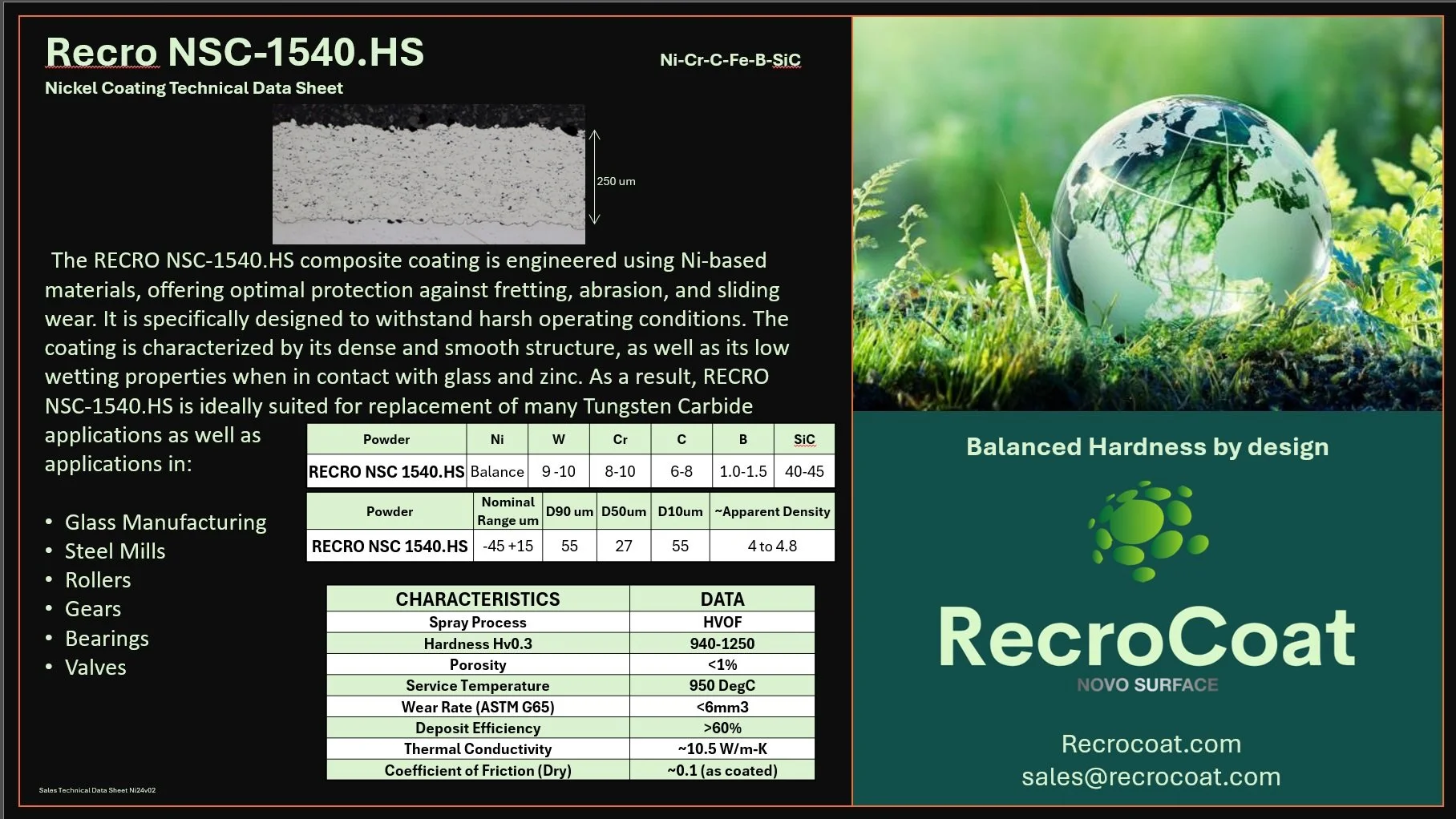 Applied in the as-sprayed condition (with only minimal polishing on moulds, if needed), this coating has demonstrated exceptional durability with over 10 months of continuous operation.